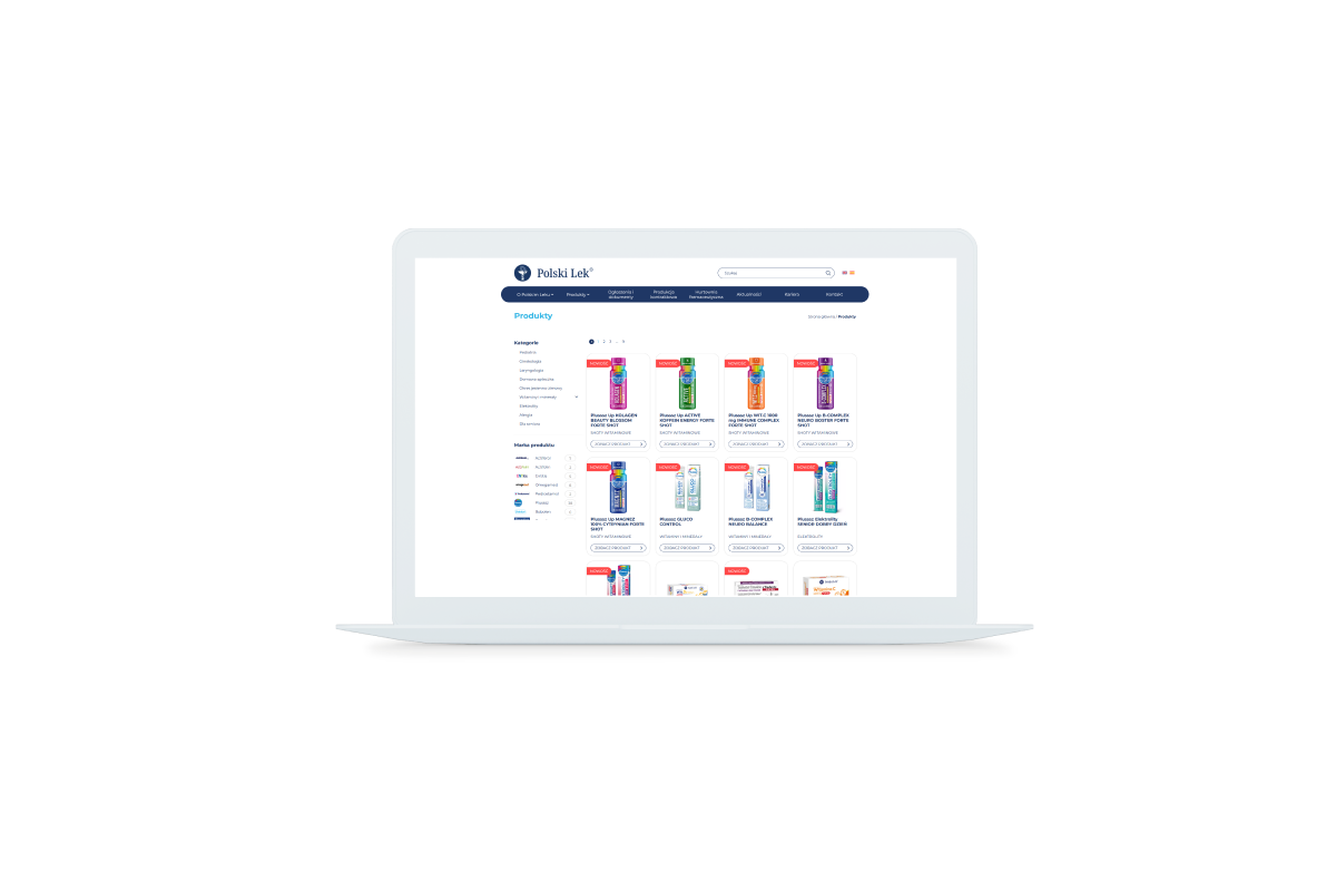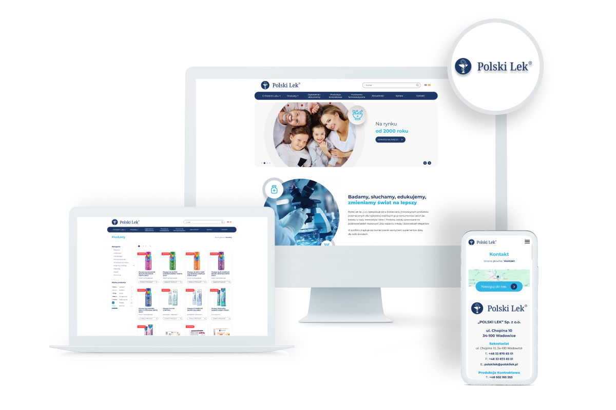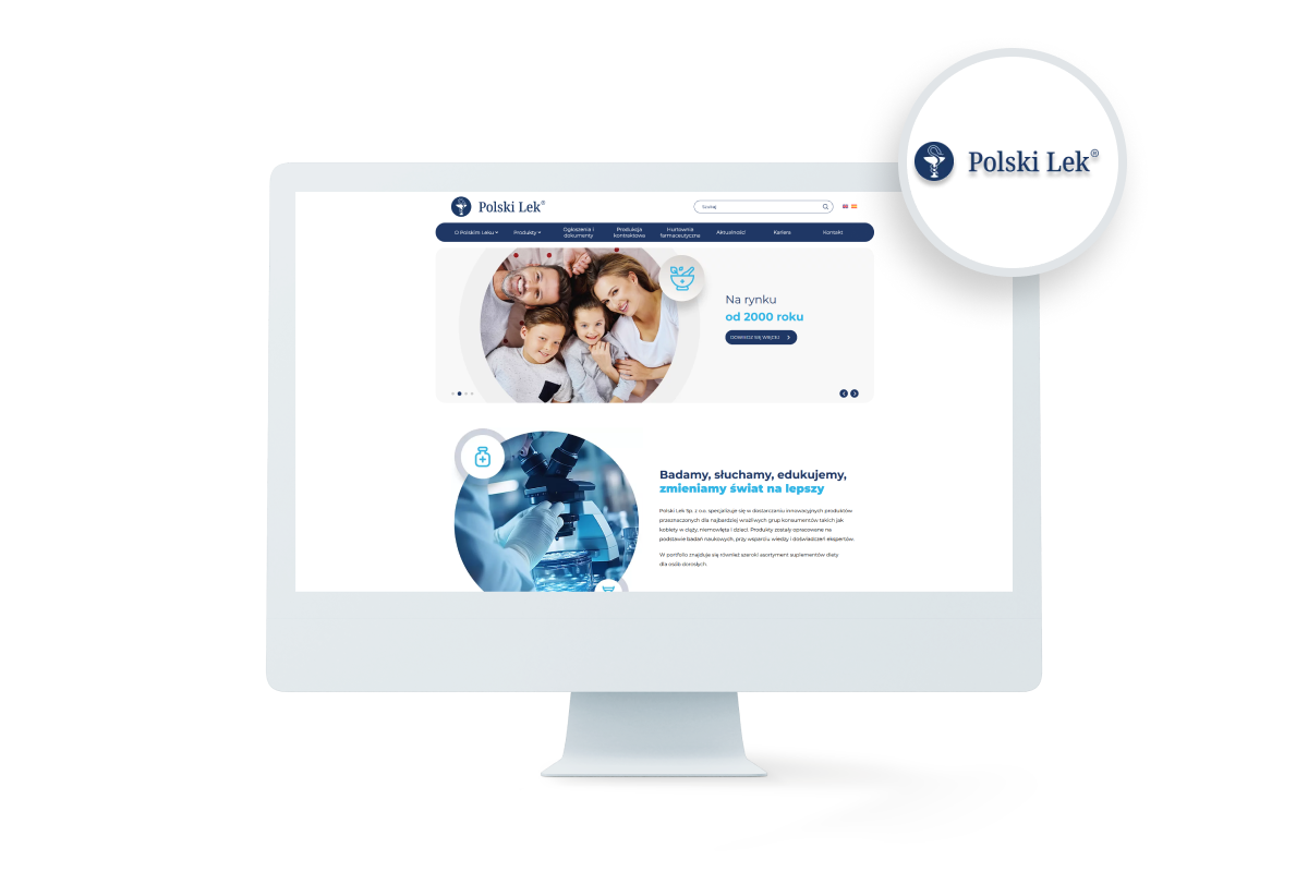 Projekt dla Polski Lek udowodnił, że w branży farmaceutycznej „mniej znaczy więcej”. Czysty layout w połączeniu z solidnym katalogiem i obsługą wielu języków to przepis na skuteczny serwis korporacyjny klasy Premium.